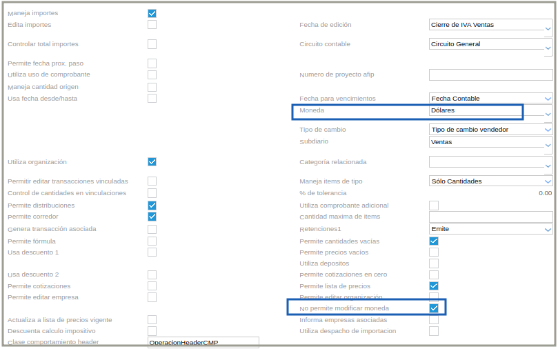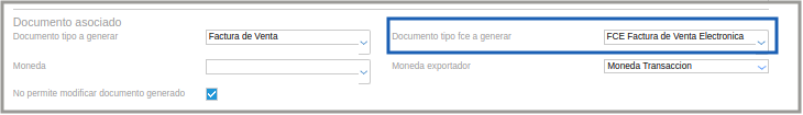 Si se tiene un contrato/pedido en USD y el proceso tiene configurada para la facturación la moneda Pesos, pero lo que se desea es facturar con moneda dólar (que es la moneda del contrato/pedido), el documento a generar (en este caso “Factura de Venta Electrónica”) tiene que configurarse con la moneda en dólares y el check “no permite modificar moneda”.