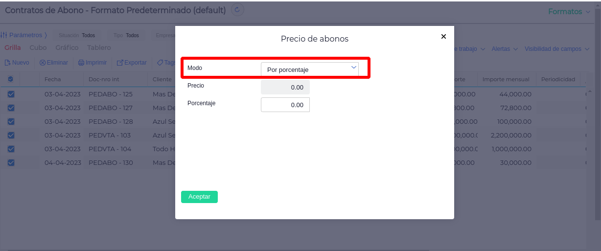 Dentro de los contratos de abono, se deben seleccionar todos los contratos que se deseen actualizar. Luego, se debe hacer clic en la opción “modificar el precio” y elegir si se quiere realizar el aumento porcentualmente o por importe fijo.