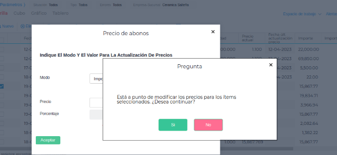 - Hacer clic en “Aceptar”. Al clickearlo, saldrá un mensaje de alerta dónde pedirá que confirmes la acción de modificar precio, o caso contrario volverá al popup de edición: