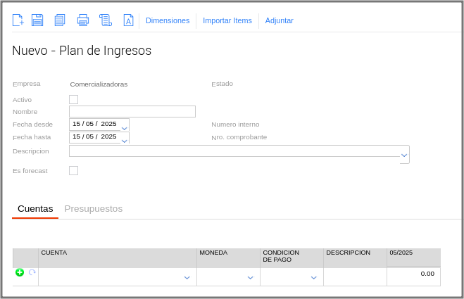 Para generar un nuevo Plan de Ingresos se accede desde Menú → Gestion Empresarial → Presupuesto → Transacciones → Planes → Nuevo → Plan de Ingresos