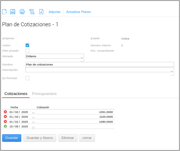 - Plan Privado: indica si el plan es privado o no. No se pueden generar dos planes para la misma moneda. Si por algún motivo se requiere realizar un segundo Plan de Cotización para la misma moneda, debe seleccionarse la opción privado.