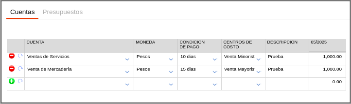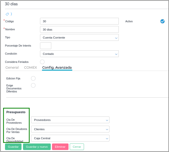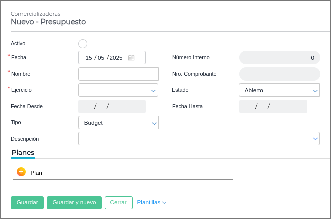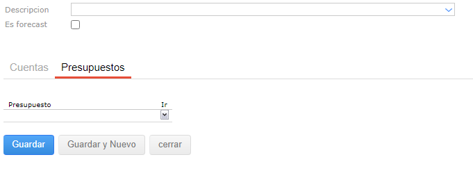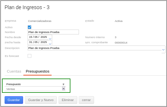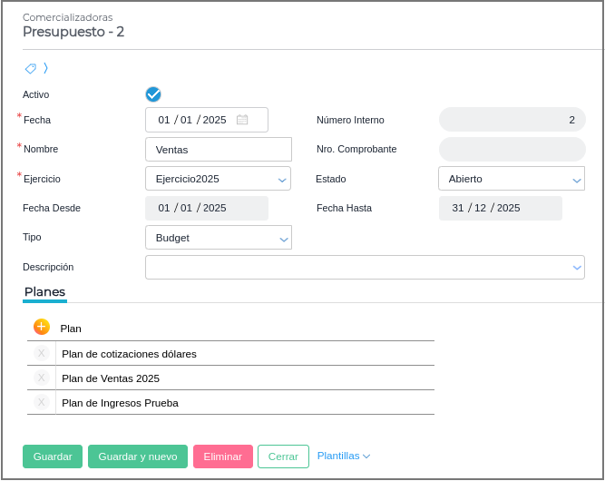 - Activo: es un check box que indica si el presupuesto se encuentra o no disponible para su utilización en otras transacciones.