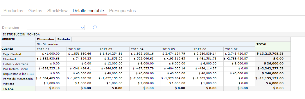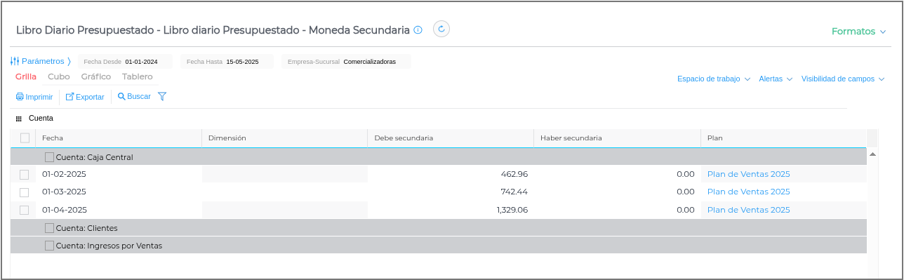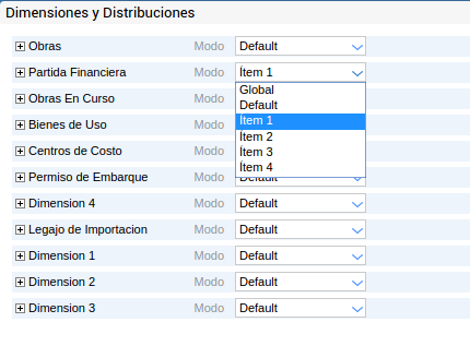 - Dimensión Valor: las columnas de Dimensión Valor sólo se verán en caso de configurar previamente en Distribuciones por ítem (desde el botón Dimensiones de la barra de herramientas).