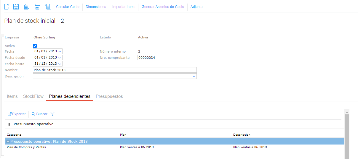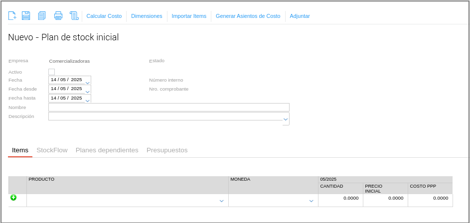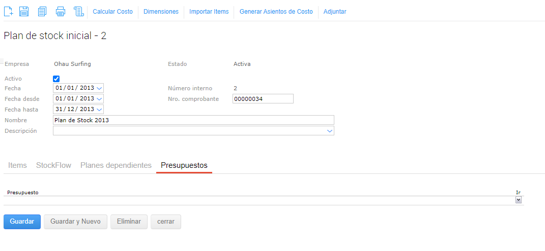 Para generar un nuevo Plan de Stock Inicial se accede desde Menú → Gestion Empresarial → Presupuesto → Transacciones → Planes → Nuevo → Plan de Stock Inicial.