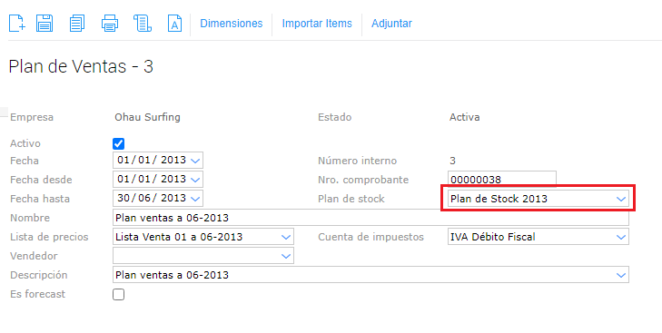 - Activo: indica si el plan creado se encuentra o no disponible para su utilización en otras transacciones. El plan va a seguir disponible para su consulta en los distintos reportes del sistema donde intervenga, aunque el mismo ya no esté activo.
