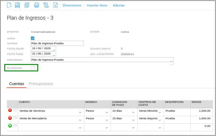 Si los planes tienen marcado el check “Es forecast” vas a poder visualizarlos en el Cashflow o en un Forecast Económico.