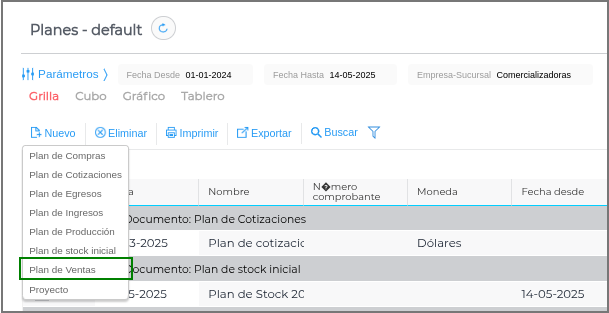 Podés acceder desde Menú → Gestion Empresarial → Presupuesto → Transacciones → Planes.
