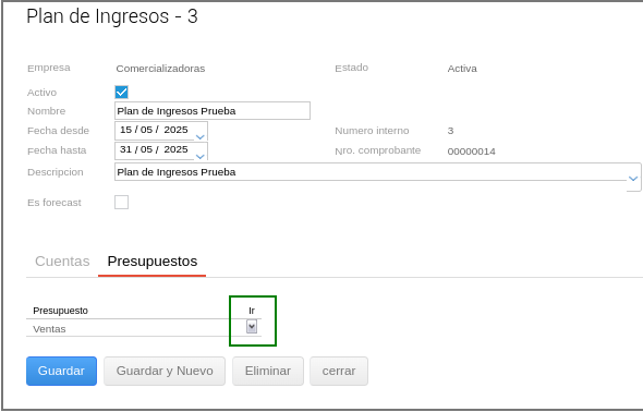 En esta solapa se muestran los presupuestos asociados a este Plan de Ingresos. Esto se explica en detalle, más adelante en Presupuestos.