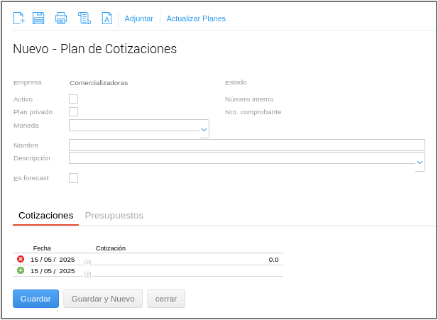 Para generar un nuevo Plan de Cotizaciones se accede desde Menú → Gestion Empresarial → Presupuesto → Transacciones → Planes → Nuevo → Plan de Cotizaciones.
