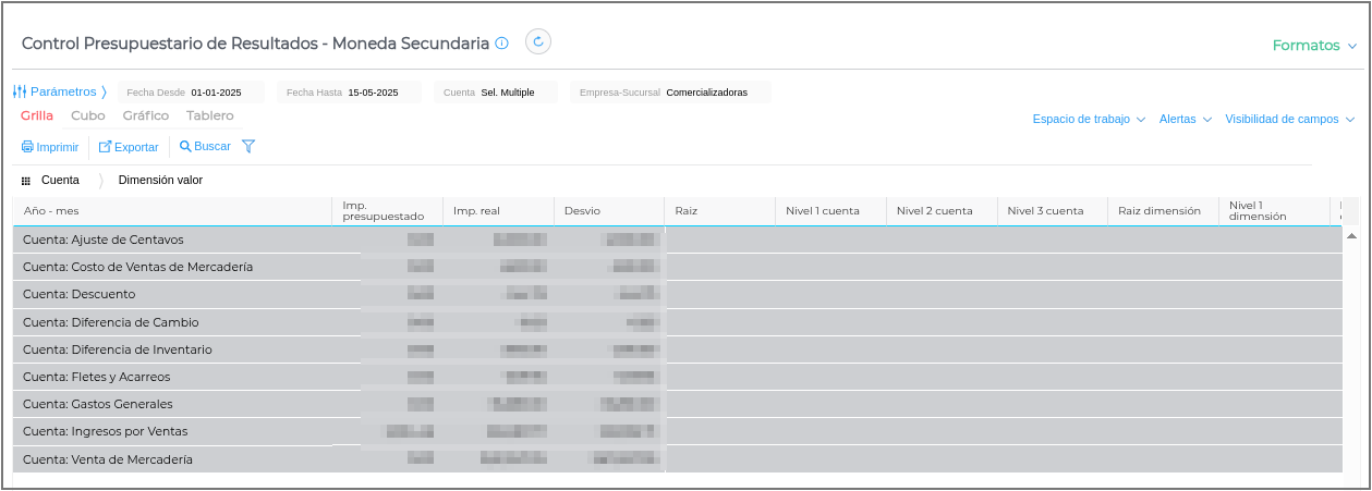Se accede desde Menú → Gestion Empresarial → Presupuesto → Control Presupuestario → Control Presupuestario de Resultados.
