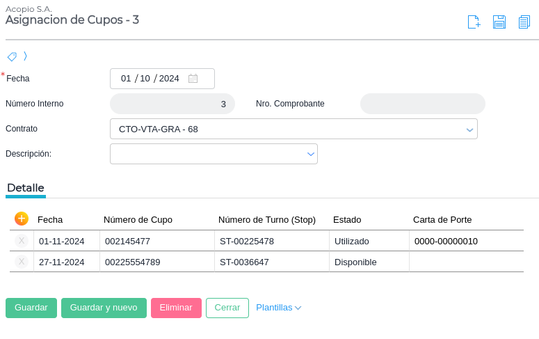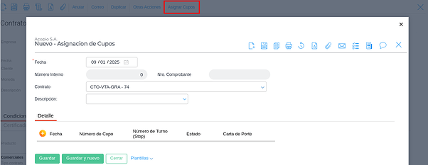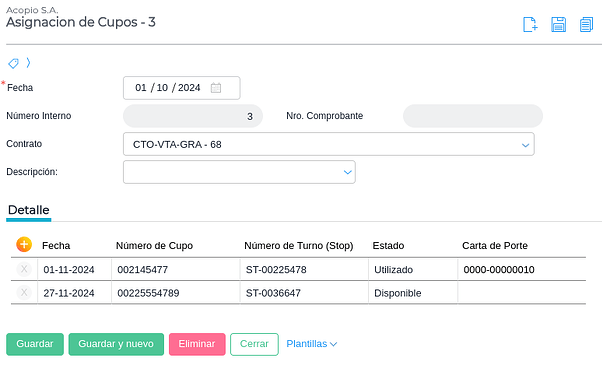 Inicialmente se crean las asignaciones con sus cupos correspondientes, indicando también un único contrato de venta de granos. De esta forma solo se le podrán asignar turnos a los traslados que estén vinculados a algún contrato con asignación de cupo.