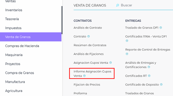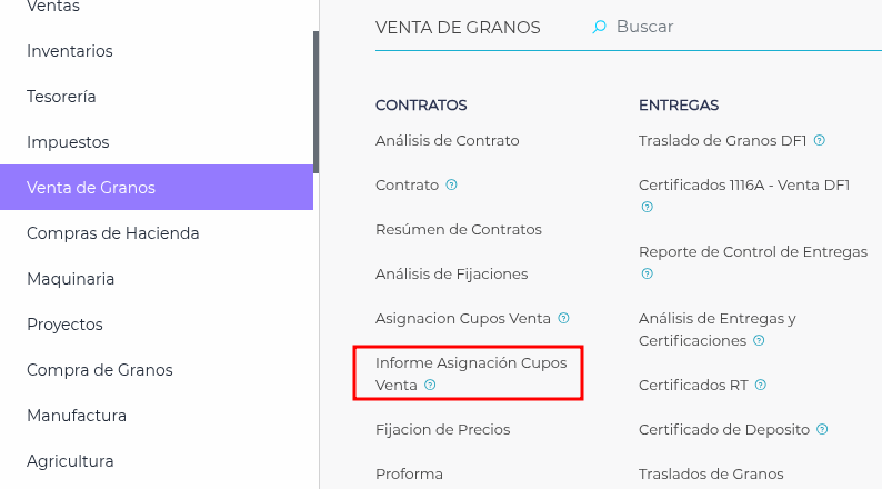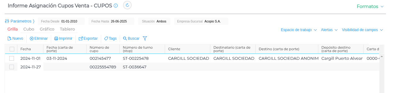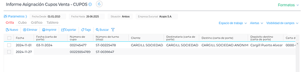 Para detallar la información general de cómo se administraron los cupos y turnos, está disponible el informe de asignación desde Venta de Granos → Informe Asignación Cupos Venta