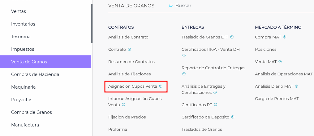 - Desde el Menú Desplegable → Gestión Empresarial → Venta de Granos → Asignación de cupos venta: