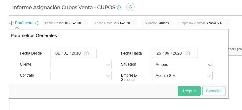 En este informe se puede filtrar por la situación actual de los cupos (si ya fue utilizado en alguna carta de porte o está disponible), también por contrato o por cliente: