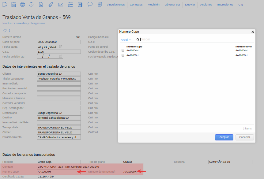 Después de haber dado de alta las asignaciones y asociarlas al contrato, se vincula el traslado de venta de granos al contrato. De esta forma se podrá seleccionar el turno correspondiente desde la opción “Número de cupo”.