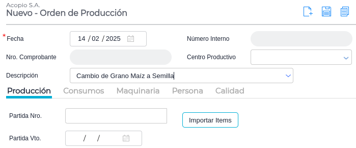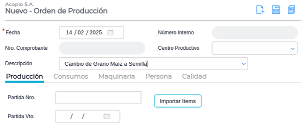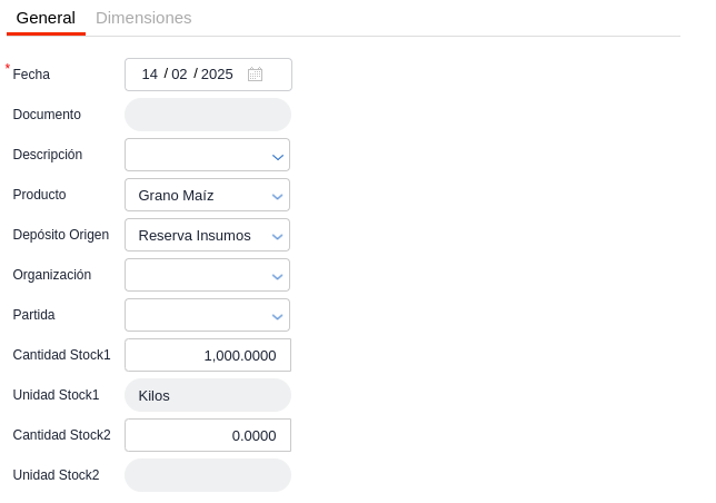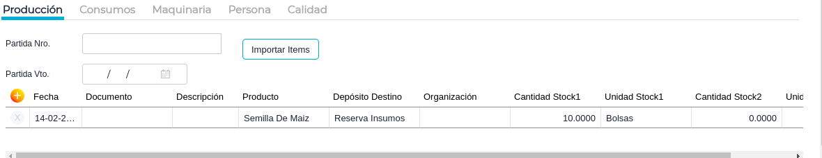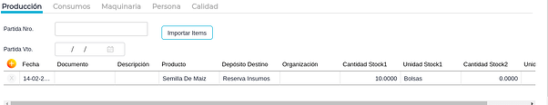 En esta solapa será necesario cargar el producto que será producido, el depósito en donde se almacenará y la cantidad de stock tanto en unidad uno como dos. Para el presente ejemplo será bolsas..
