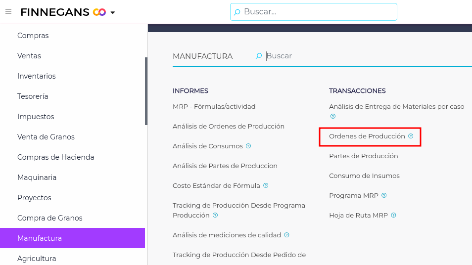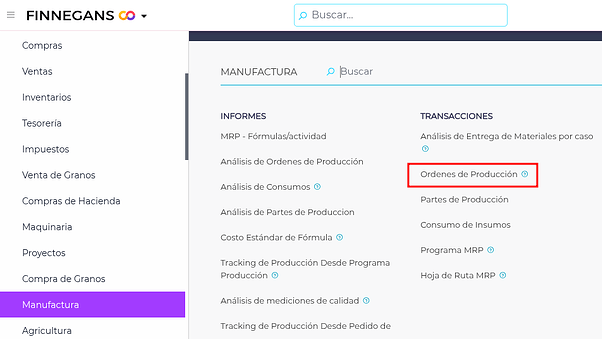 Se accede desde Menú Desplegable → Gestión Empresarial → Manufactura → Órdenes de Producción: