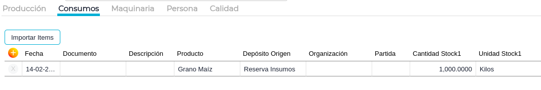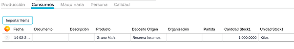 En ella se expresará la fecha del consumo, el producto a consumir, el depósito de donde se extraerá dicho producto. Se puede expresar también, en este caso particular la partida de dicho grano, y la organización si ese stock perteneciese a un tercero. Al igual que la otra solapa, se debe especificar la cantidad de stock uno y la dos.