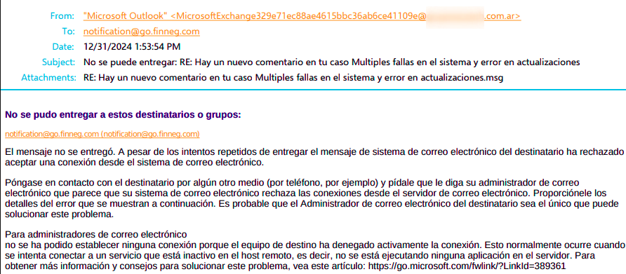 Al enviar un correo al servidor de mail de Finnegans, este rebota.
