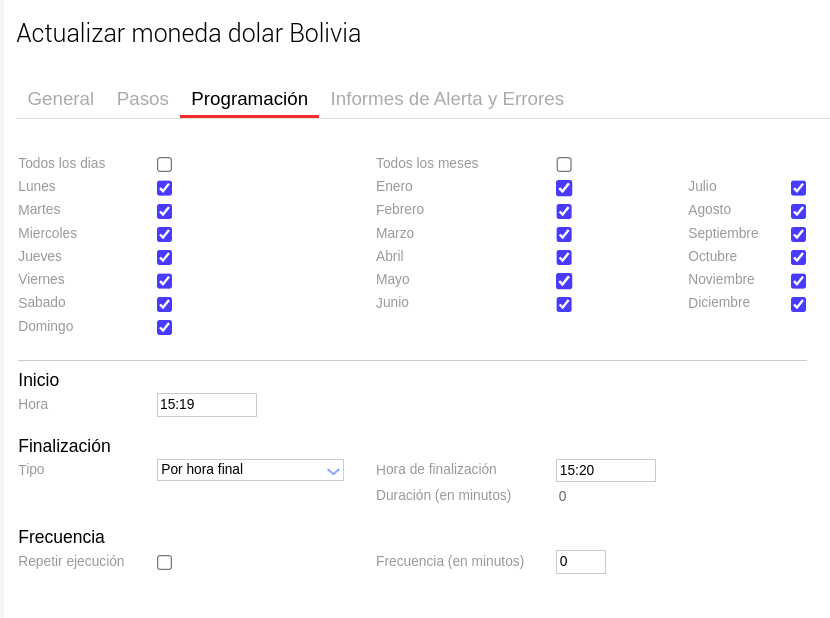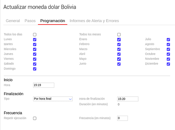 Realizado este paso, en la solapa Programación, observaremos varios campos con información que podremos modificar manualmente, tales como: la hora de inicio, la hora de finalización y la frecuencia. También, podremos tildar si queremos que la consulta se realice todos los días y todos los meses.