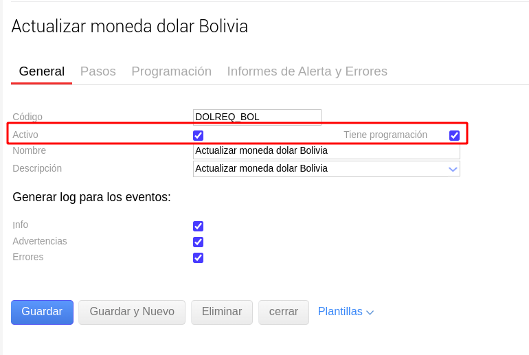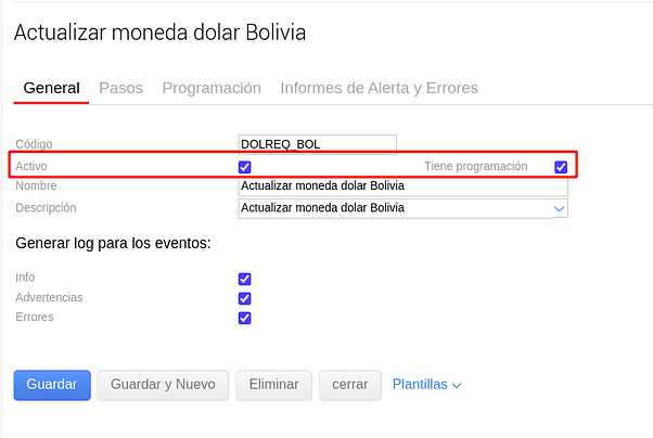 En esta instancia será necesario validar que en la solapa General, se encuentren tildadas las casillas: Activo y Tiene programación.