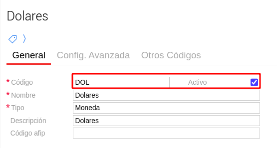 Crear una moneda en el maestro de “MONEDA” llamada Dólares cuyo código sea “DOL” y tenga tildado el check de “Activo”