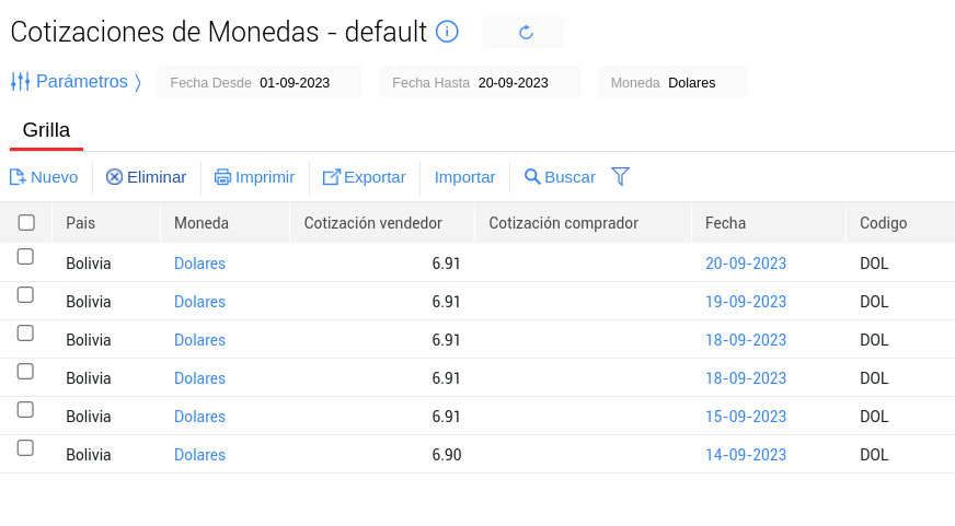 En la view Cotización de Monedas, veremos el valor de la moneda para el momento en que se realiza la consulta.