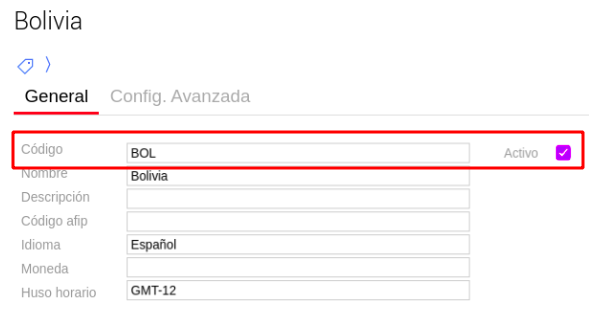 Luego en el Maestro de Países, deberemos tener creado el país Bolivia, también colocar en código BOL y tildar el check “Activo”