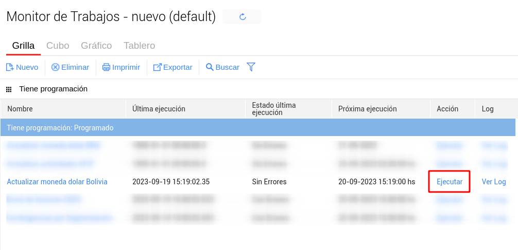 En ella veremos el trabajo “Actualizar Moneda dólar Bolivia” el cual tiene un botón llamado “Ejecutar” que al hacer clic, realizará la consulta y podremos observar un nuevo resultado en la view Cotización de monedas.