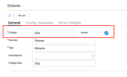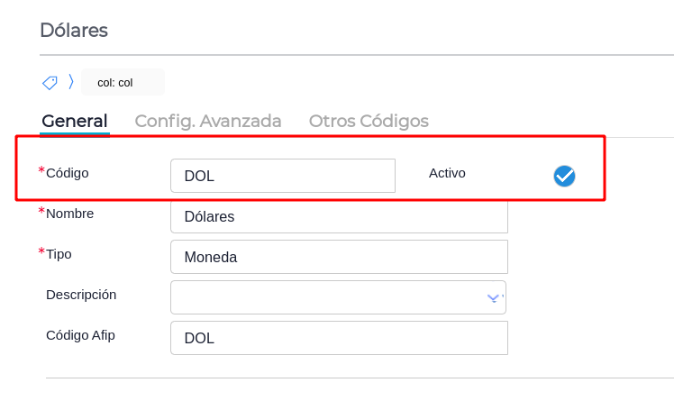 Crear una moneda en el maestro de “MONEDA” llamada Dólar/Dólares cuyo código sea “DOL” y tenga tildado el check de “Activo”