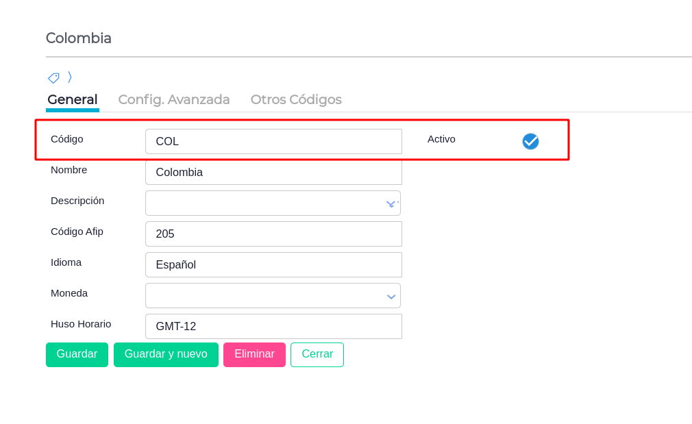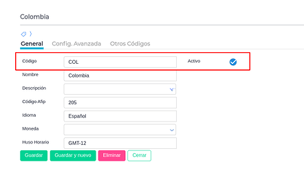 Luego en el Maestro de Países, deberemos tener creado el país Colombia, también colocar en código COL y tildar el check “Activo”