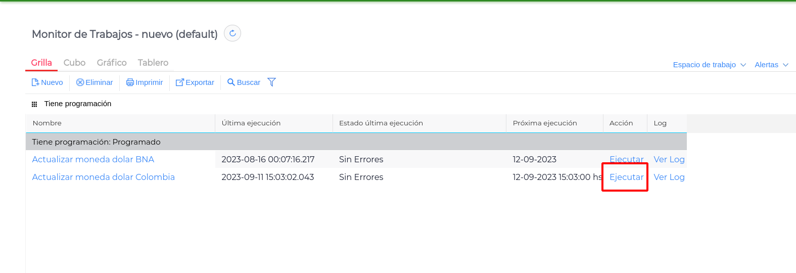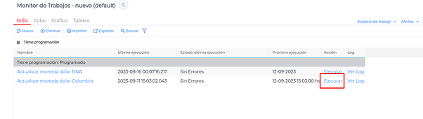 En ella veremos el trabajo “Actualizar Moneda dólar Colombia” el cual tiene un botón llamado “Ejecutar” que al hacer clic, realizará la consulta y podremos observar un nuevo resultado en la view Cotización de monedas.