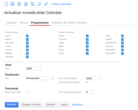 Realizado este paso, en la solapa Programación, observaremos varios campos con información que podremos modificar manualmente, tales como: la hora de inicio, la hora de finalización y la frecuencia. También, podremos tildar si queremos que la consulta se realice todos los días y todos los meses.