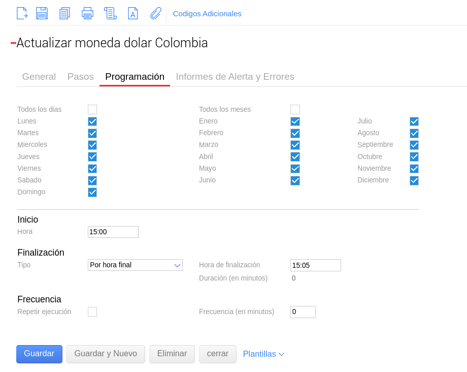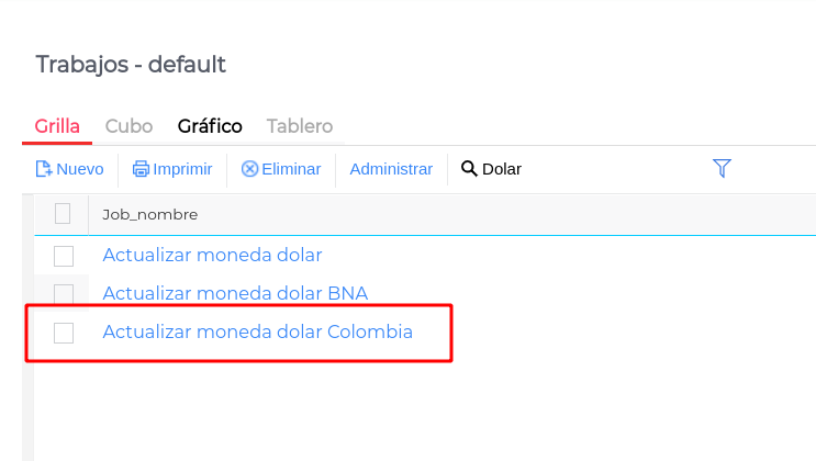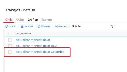 En el maestro de trabajos vamos a encontrar un trabajo llamado “Actualizar Moneda dólar Colombia”.
