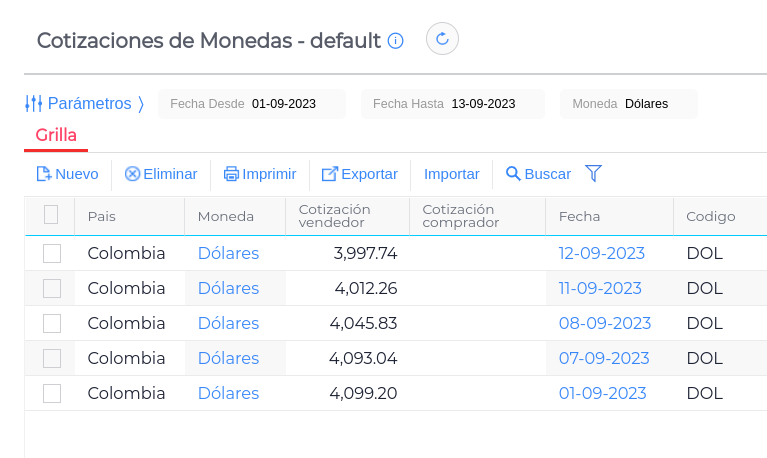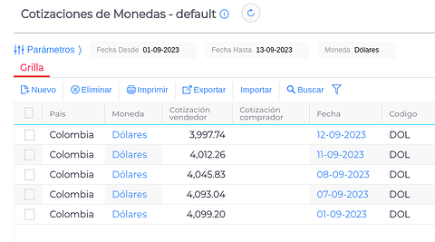 En la view Cotización de Monedas, veremos el valor de la moneda para el momento en que se realiza la consulta.