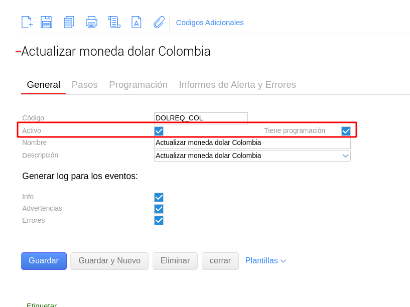 En esta instancia será necesario validar que en la solapa General, se encuentren tildadas las casillas: Activo y Tiene programación.