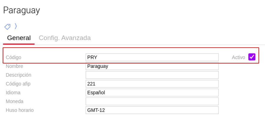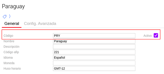 Luego en el Maestro de Países, deberemos tener creado el país Paraguay, también colocar en código PRY y tildar el check “Activo”