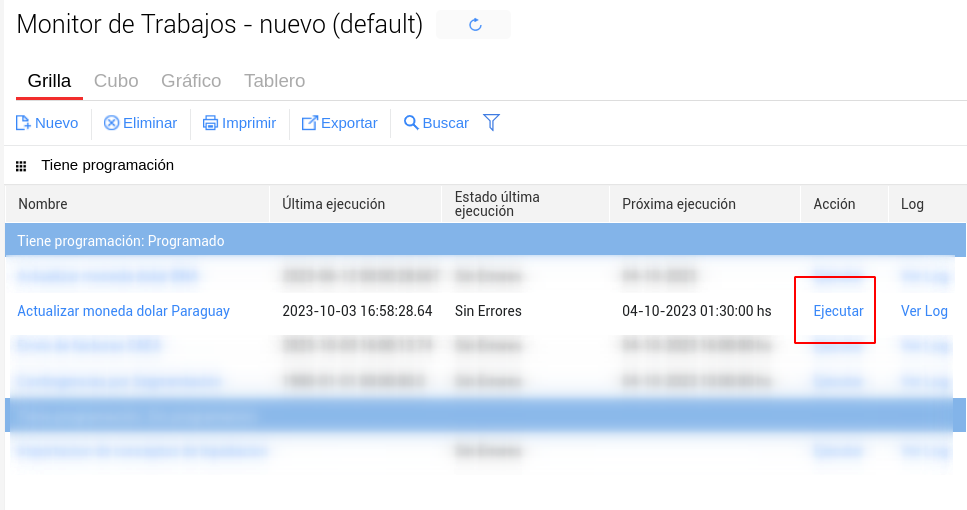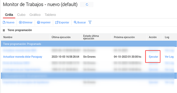 En ella veremos el trabajo “Actualizar Moneda dólar Paraguay” el cual tiene un botón llamado “Ejecutar” que al hacer clic, realizará la consulta y podremos observar un nuevo resultado en la view Cotización de monedas.