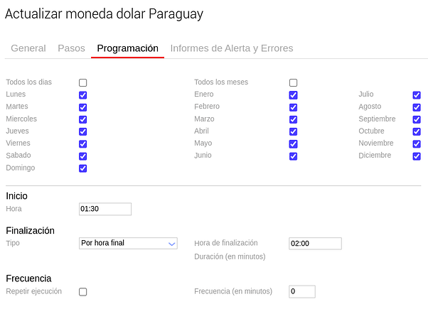 Realizado este paso, en la solapa Programación, observaremos varios campos con información que podremos modificar manualmente, tales como: la hora de inicio, la hora de finalización y la frecuencia. También, podremos tildar si queremos que la consulta se realice todos los días y todos los meses.