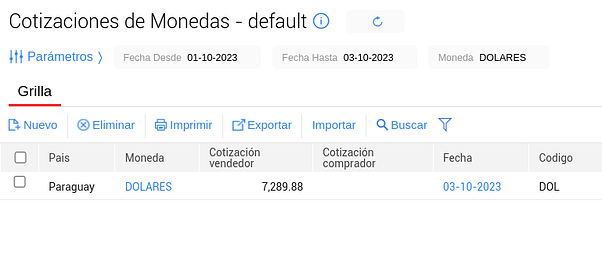 En la view Cotización de Monedas, veremos el valor de la moneda para el momento en que se realiza la consulta.