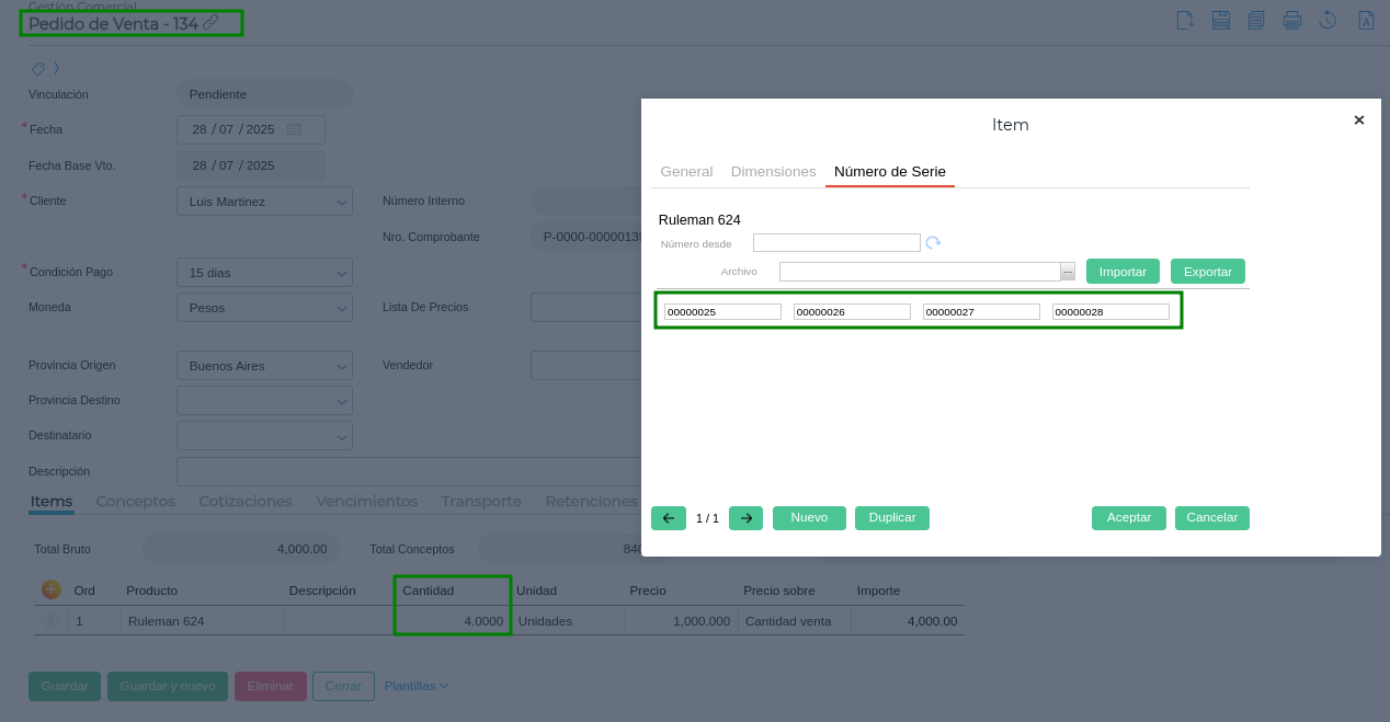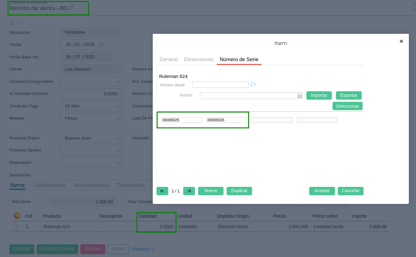 Al vincular parcialmente 2 de las 4 unidades del Pedido de Venta, se observa que el Remito de Venta hereda correctamente los dos primeros números de serie correspondientes al producto del Pedido: