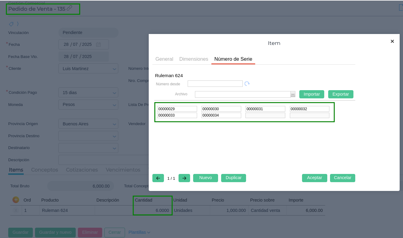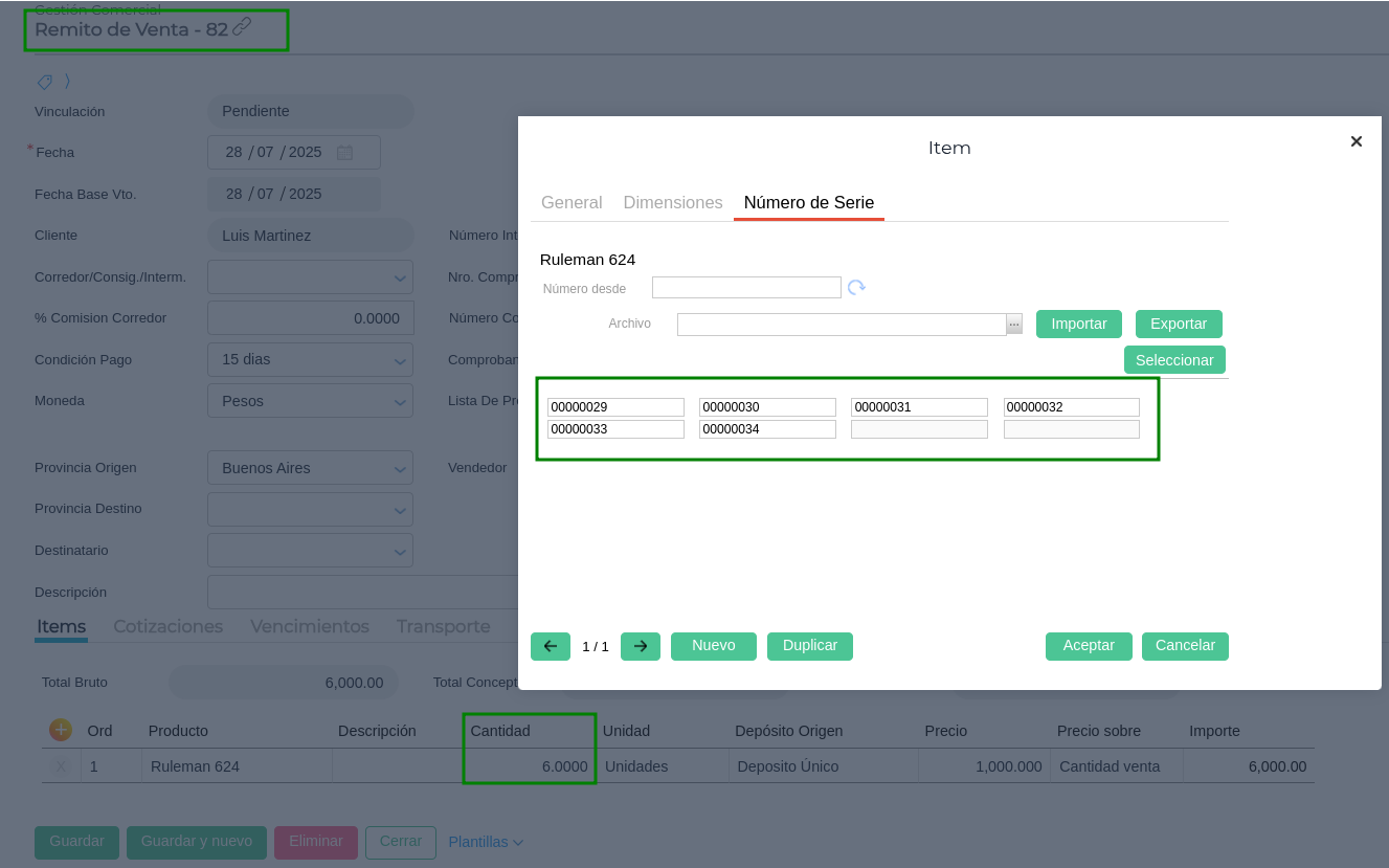 Al vincular totalmente las 6 unidades del Pedido de Venta, se observa que el Remito de Venta hereda correctamente todos los números de serie correspondientes al producto del Pedido: