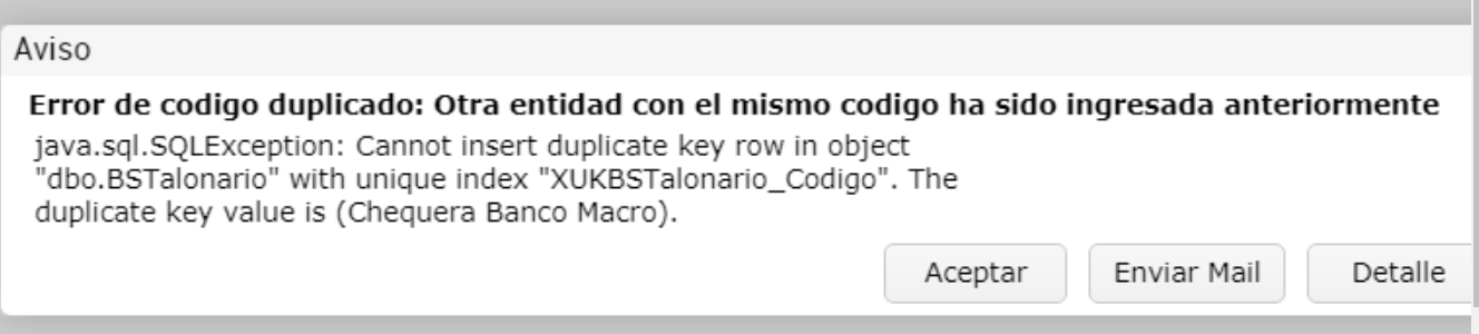 Al crear chequera nueva sale mensaje de aviso “ Error de código duplicado: Otra entidad con el mismo código ha sido ingresada anteriormente”