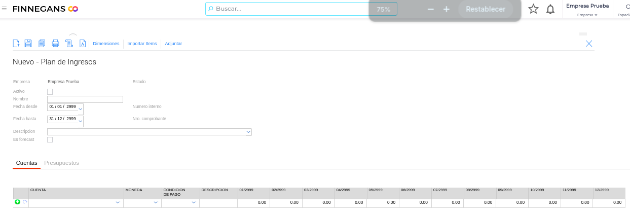 Refleja en el sistema una planificación posible de los Ingresos para una fecha o periodo determinado. Se indica la cuenta del Ingreso (cuenta de resultado) y el valor del mismo mes a mes permitiendo de esta forma tener una estimación de los Ingresos que la empresa va a tener.