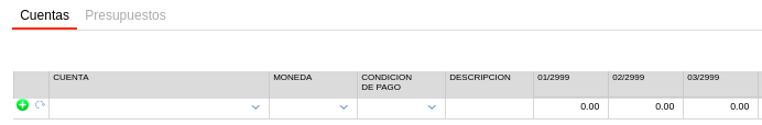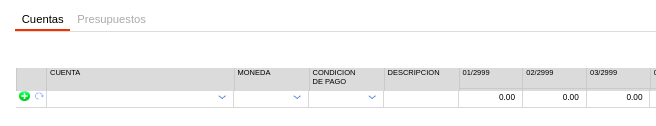 - Condición de pago: es la condición de pago del gasto. En la Condición de Pago se configuran las cuentas contables que están involucradas en el plan.