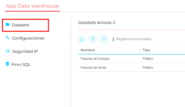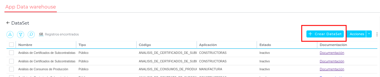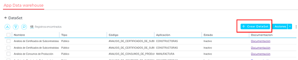 Abrir la app DataWarehouse y entrar en Datasets: