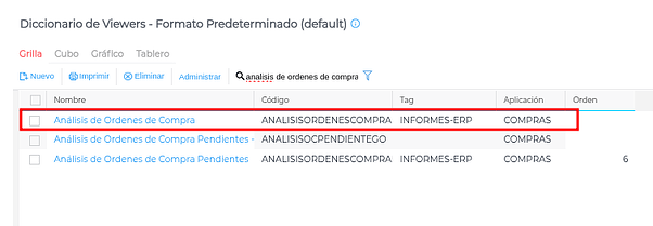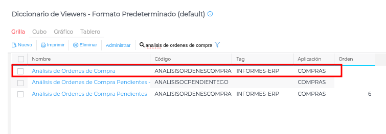 Luego, en el buscador escribir el nombre de la vista, por ejemplo “Análisis de Órdenes de Compra”, e ingresar: