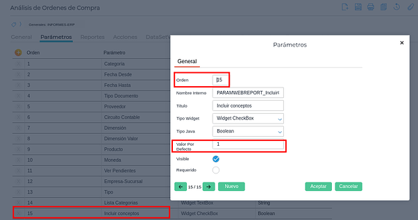 Por ejemplo, para el Análisis de Órdenes de Compra con el SP P_BS_OP_0010 y los siguientes parámetros:
