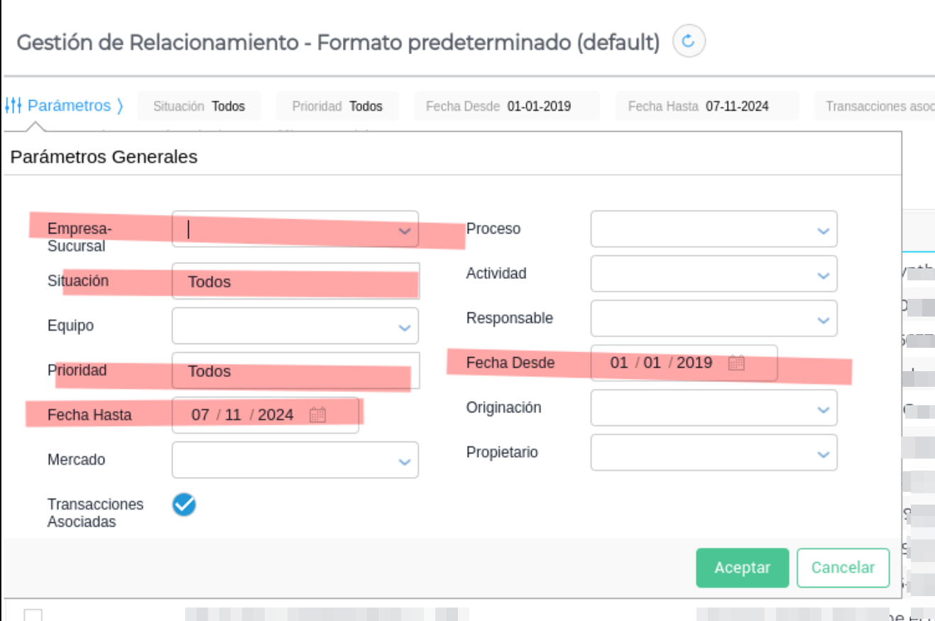 Dentro de los parámetros de consulta, seleccionar el rango deseado, por ejemplo, desde 01/01/2019 hasta el 07/11/2024 (cuanto más amplio sea el rango mejor) - Quitar filtros de empresas (para que traiga todas)