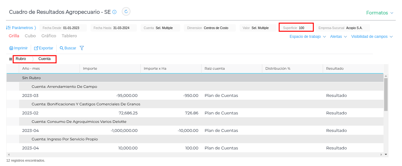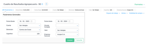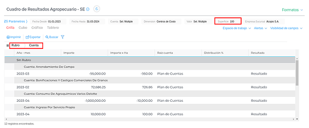 Posteriormente, se tendrán que asignar los siguientes filtros de acuerdo a las sucursales o empresas, rango de fechas, actividad, cuentas de resultados y superficie total en hectáreas.Como se observa en la siguiente imagen y a criterio de cada usuario, es posible organizar, agrupar o editar la grilla como sea más conveniente para su análisis (recordar guardar el formato para tenerlo disponible siempre de la misma forma).
